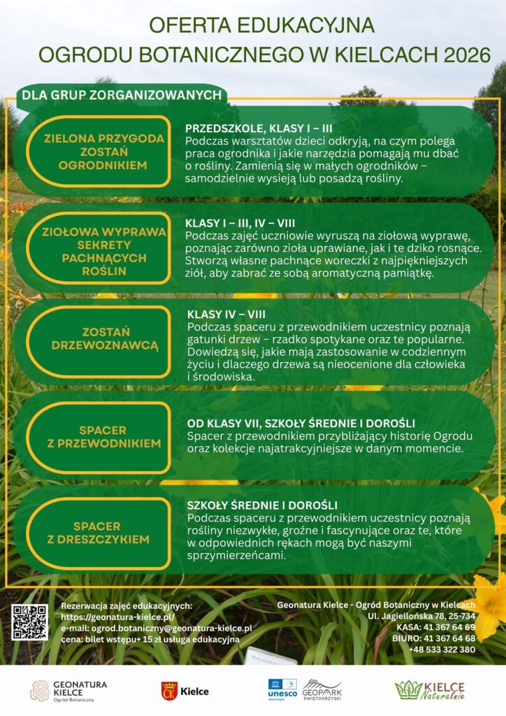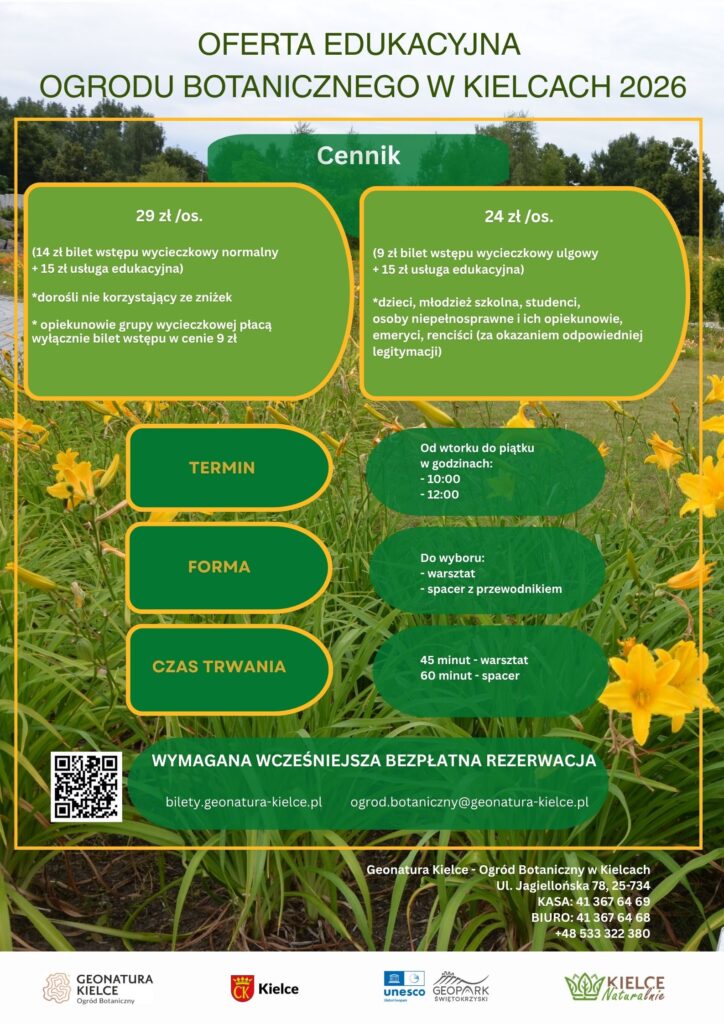 Dlaczego warto? -nauka poprzez doświadczenie i bezpośredni kontakt z naturą -rozwijanie uważności i wrażliwości na środowisko -zajęcia prowadzone przez doświadczonych edukatorów -programy dostosowane do wieku uczestników Informacje organizacyjne Zajęcia przeznaczone dla grup zorganizowanych od 11 osób cena: bilet wstępu + 15 zł / osoba (usługa edukacyjna) miejsce: Ogród Botaniczny w Kielcach, ul. Jagiellońska 78 Rezerwacja: – https://bilety.geonatura-kielce.pl/ – ogrod.botaniczny@geonatura-kielce.pl Informacje: Tel. +48 533 322 380
